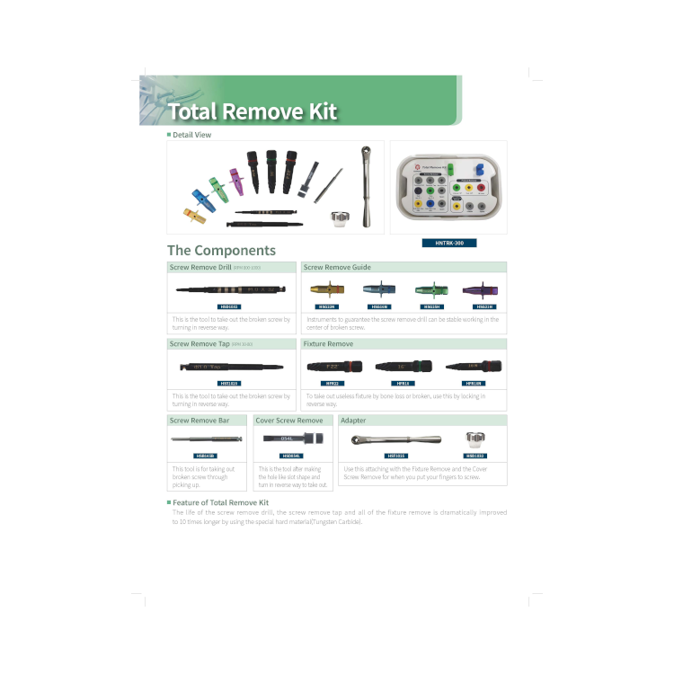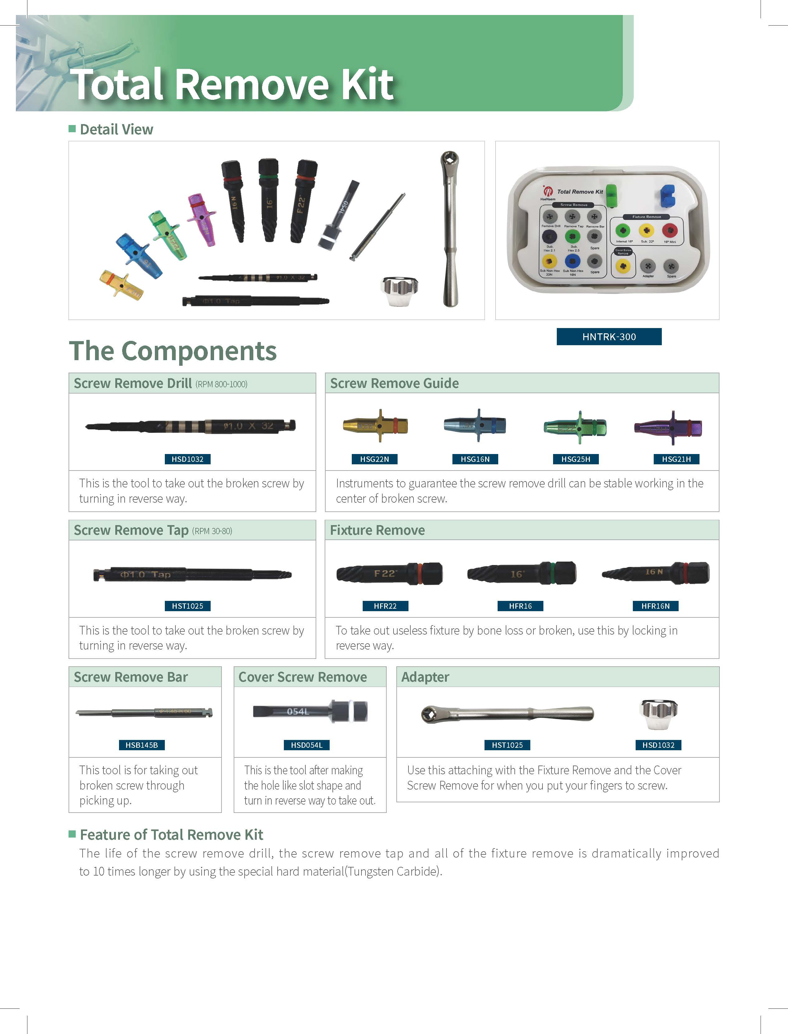 It contains new implant removal instruments that lessen rotational slippage to permit greater control over the implant removal process. It is founded on the recognized counter-torque and reverses screw practice.