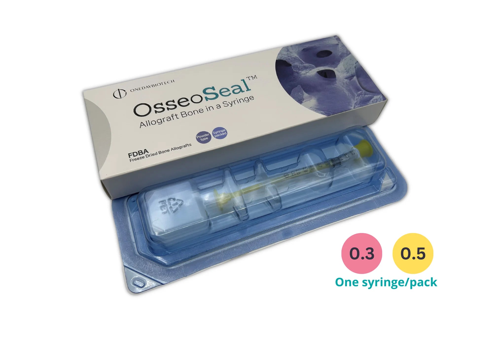 OsseoSeal bone in syringe is a mixture of allograft mineralized cortical and cancellous powder in a convenient syringe with a filter cap! Curved syringe for better access to site. The cancellous and cortical blend forms an osteoconductive scaffold providing volume enhancement and effective site development for successful dental implant placement.