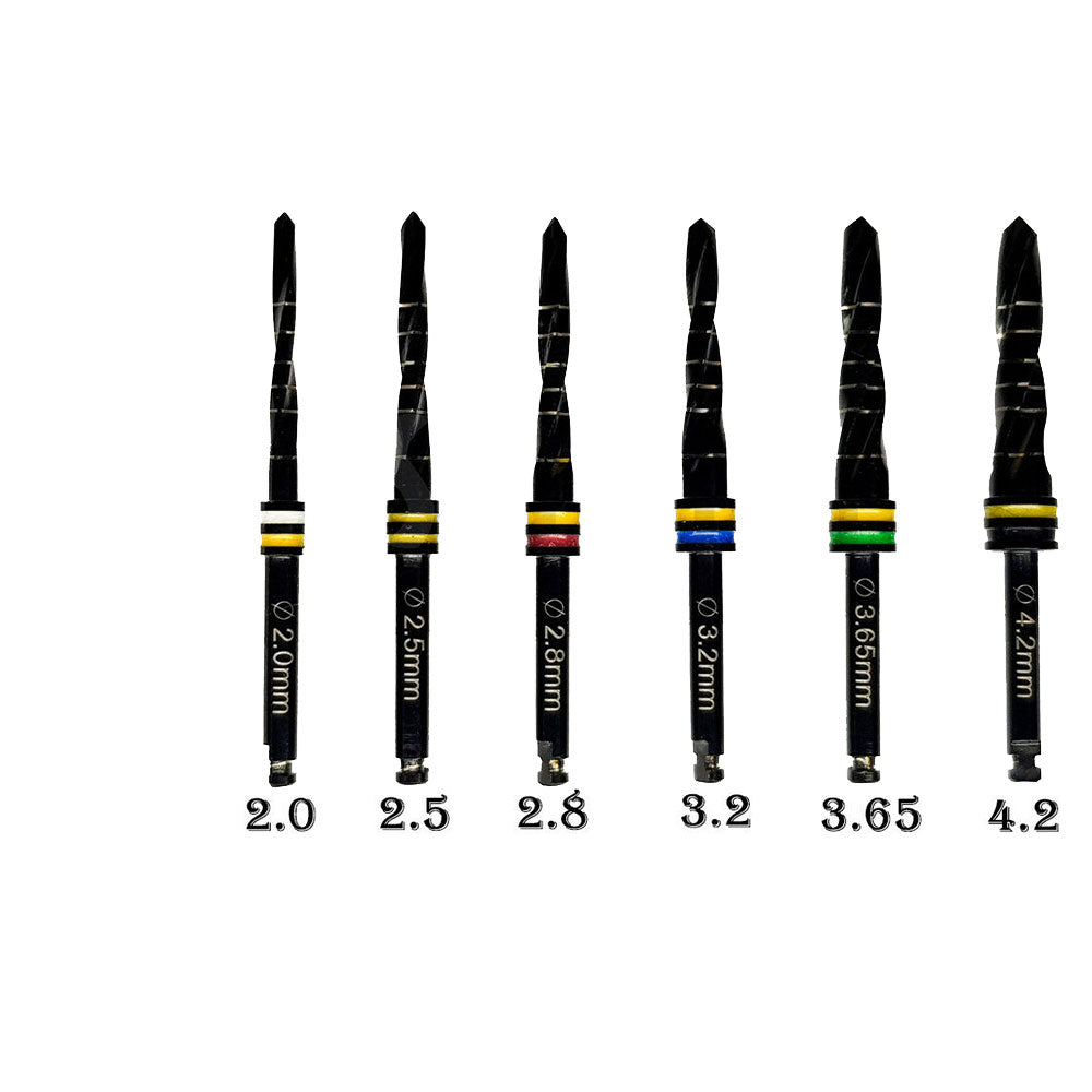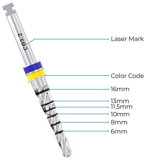 All drills are color-coded with clear depth marks for easy identification of the osteotomy depth.